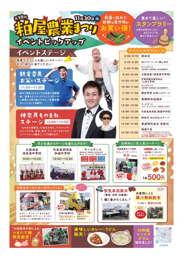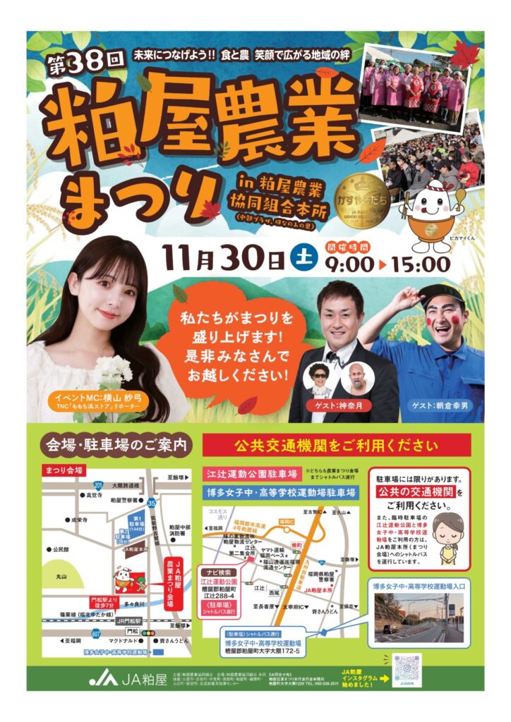 11月30日(土)、粕屋農協本所(中部プラザ・旧なのみの里)にて、“第38回粕屋農業まつり”を開催します!