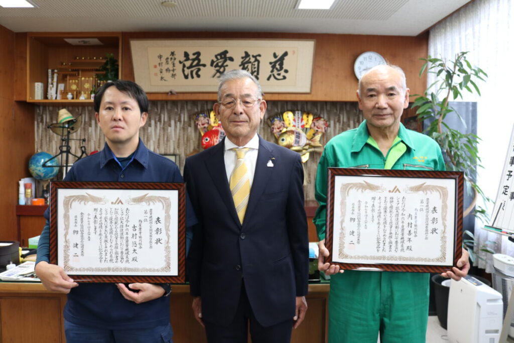 5月12日、本所で中部プラザ農機担当職員の表彰を行いました。4月下旬にJA全農ふくれんが開いた2024年度農業機械系統シェア拡大推進運動受賞者表彰大会の、農業機械個人年間修理整備料の部で中部プラザ職員の内村善年担当と、農業機械個人年間実販台数の部で吉村悠太担当がともに第1位を獲得しました。表彰された内村担当と吉村担当は「大変光栄に思う。今年も農業機械などに関する問い合わせが増えて来るが、要望へお応えできるよう努めていきたい」と話しました。