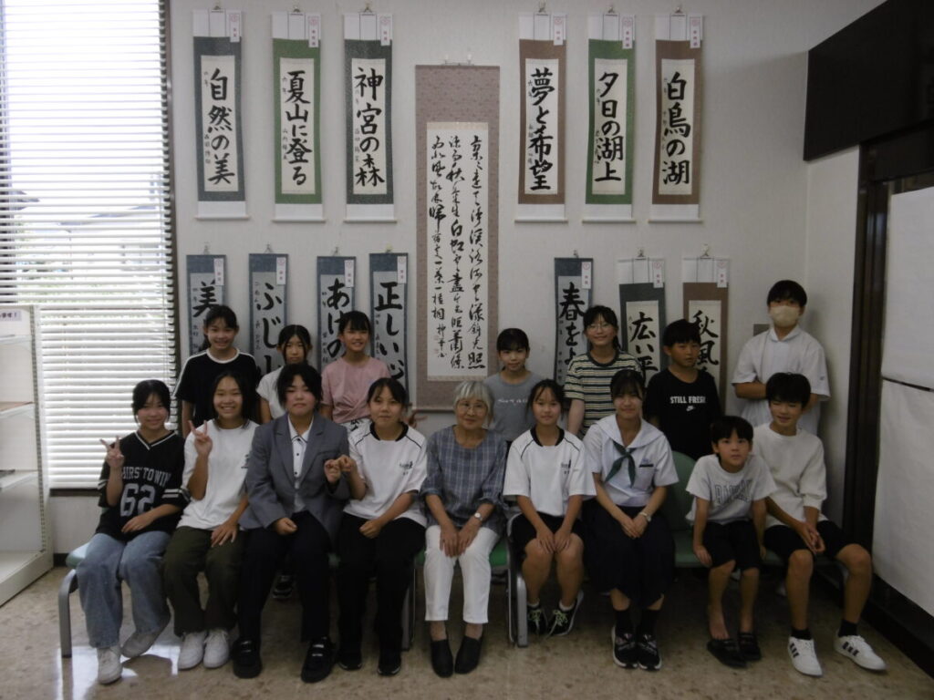 8月20日JA粕屋青柳支所へ展示した全国展入選作品を書道教室の生徒15人が見学に訪れました。