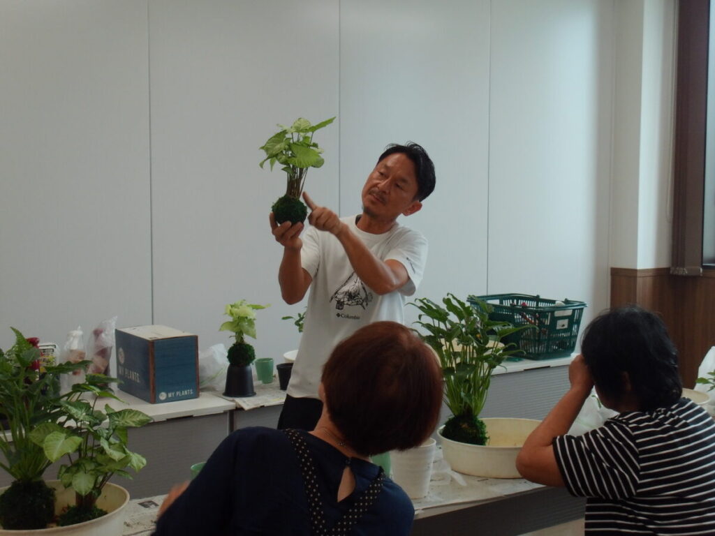 JA粕屋新宮支所女性部は9月4日支所活動で「苔玉作り」を行い、午前と午後に分かれ18人が参加しました。久山植木(株)の菅登志貴さんを講師に招き、数種類の観葉植物から自分のお気に入りを選び、自宅の部屋に吊るすタイプと置き型タイプの苔玉を作りました。参加者は「自分好みの苔玉が出来て良かった。きちんと手入れをして綺麗に飾りたい」と話しました。