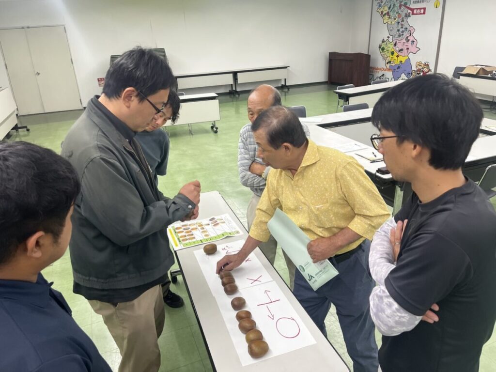 JA粕屋キウイフルーツ部会は10月3日、福岡県が育成したオリジナル品種のキウイフルーツ「甘うぃ(あまうぃ)」について、本格的な収穫・出荷を前に、生産者、ふくれん、JAが集まり「目合わせ会」を実施しました。