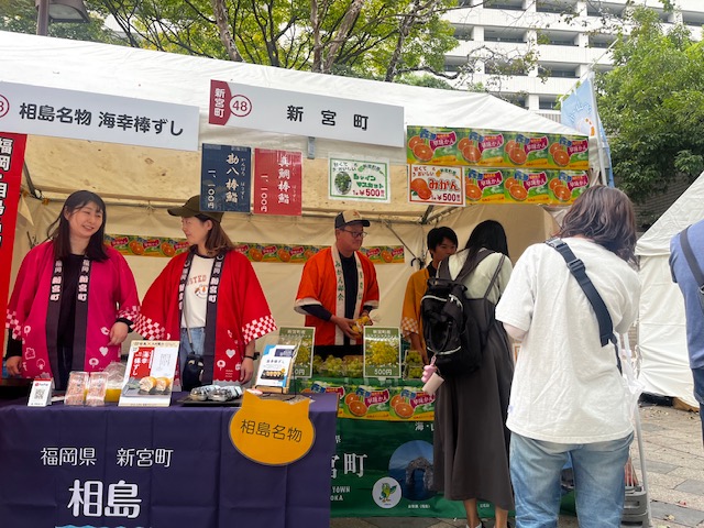 福岡県内の町村の魅力を都市圏に発信する「ふくおか町村フェア」(ふくおか町村フェア実行委員会主催)が天神中央公園で10月18日から19日にかけて開催され、会場は多くの来場者で賑わい、新宮町ブースでは、JA粕屋北部プラザが出店し、旬を迎えた福岡県産みかんのPRをしました。