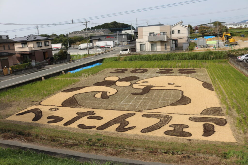 須恵町立須恵東中学校の生徒、ぺったんフェア(秋祭り)実行委員会、地元ボランティアは、10月25日、稲刈りが終わった管内の農地を利用して、田んぼアートを製作しました。自分たちが育った小学校で開かれる地域の祭りを盛り上げる役目を担ってほしい、また後輩たち(小学生)に喜んでもらい、何より地域の役に立つ喜びや達成感を味わってほしいとの思いで、もみ殻と堆肥を利用してかわいい「巳」の絵を制作しました。製作した生徒は「大変な作業だったが、完成すると改めて達成感が得られた」と話していました。