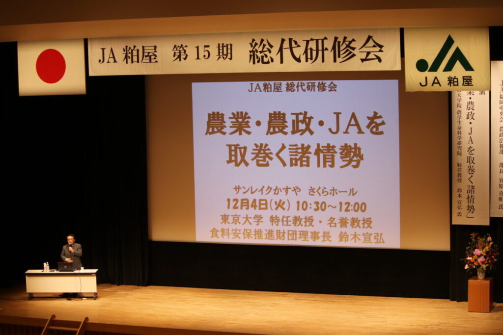 まず、JA福岡中央会農政広報部長宮原喜明氏が1.協同組合について2.JA粕屋の現状について3.総代に求められるものと題して総代としての心得を説明しました。その後は、東京大学大学院 農学生命科学研究科特任教授 鈴木 宣弘氏を招き、農業・農政・JAを取巻く諸情勢、現在の日本の農業に関わる現状と問題点について、講演を行いました。参加した組合員は、「今回の研修会を通じて、総代としての心構えの再認識が出来て良かった。組合員の声、想いをJA運営に今後も反映させていきたい」と話していました。