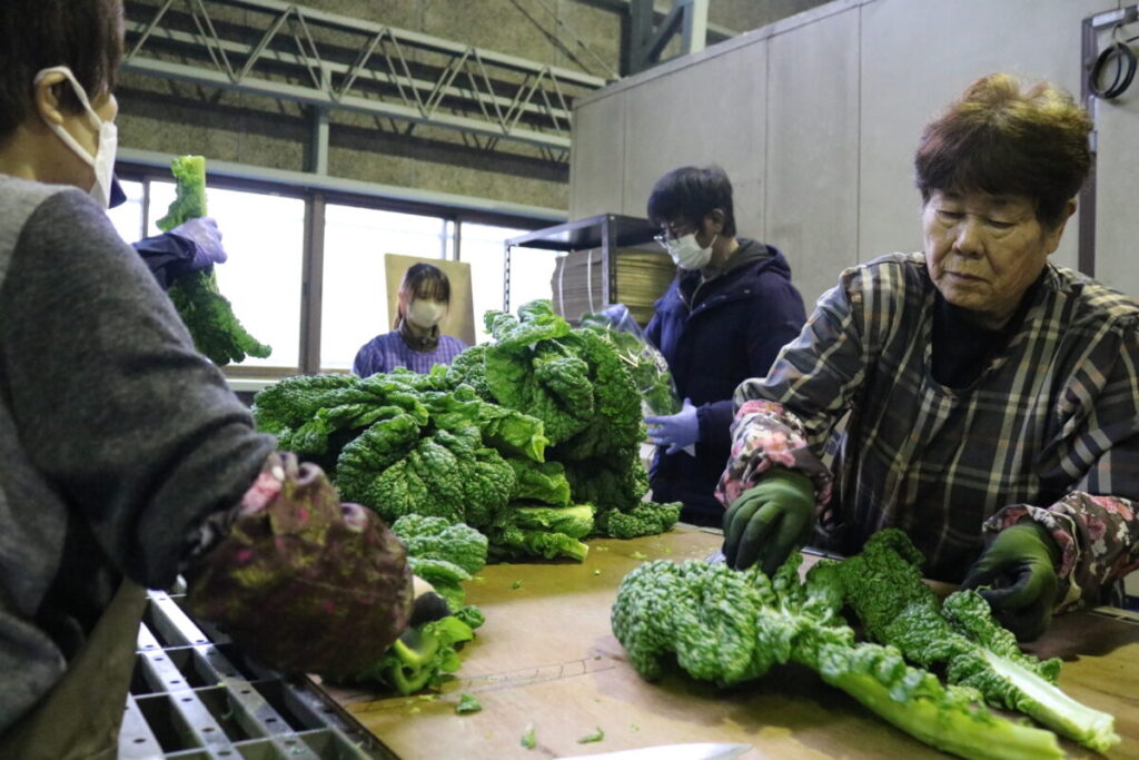 粕屋町にあるJAの集荷場では、かつお菜をスーパーで販売するためラッピングする作業に忙しく、作業員は次々に調製し、段ボール箱に入れていきました。