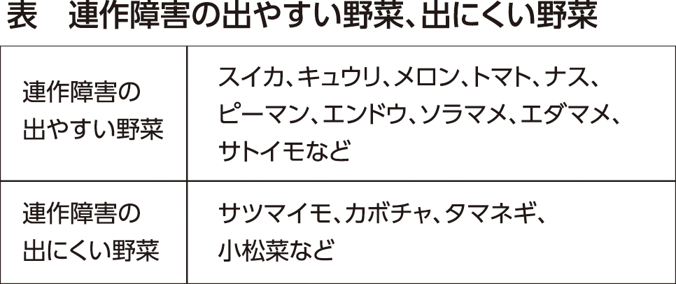 同じ畑に同じ野菜を連続して作ることを「連作」といいます。連作すると生長に障害が出る野菜があります。エンドウは一度作ると、4、5年は作れません。ナス、トマト、ソラマメ、サトイモなどは3、4年、レタス、ハクサイ、イチゴなどは2年、ホウレンソウ、コカブ、インゲンなどは1年です。サツマイモ、カボチャ、タマネギのように連作しても生長に障害が見られない野菜もあります(表)。 また、同じ科に属する近縁な野菜は似た性質を持っているため、病害虫と肥料の吸収が共通しています。そのため、連作すると土に生息する病害虫が増えたり、微量でも必要な肥料成分が不足して野菜の生長を妨げることがあります。 このような連作障害を防ぎ、地力が衰えないようにするためには性質の異なる野菜を計画的に順次、作付けする「輪作」をします。