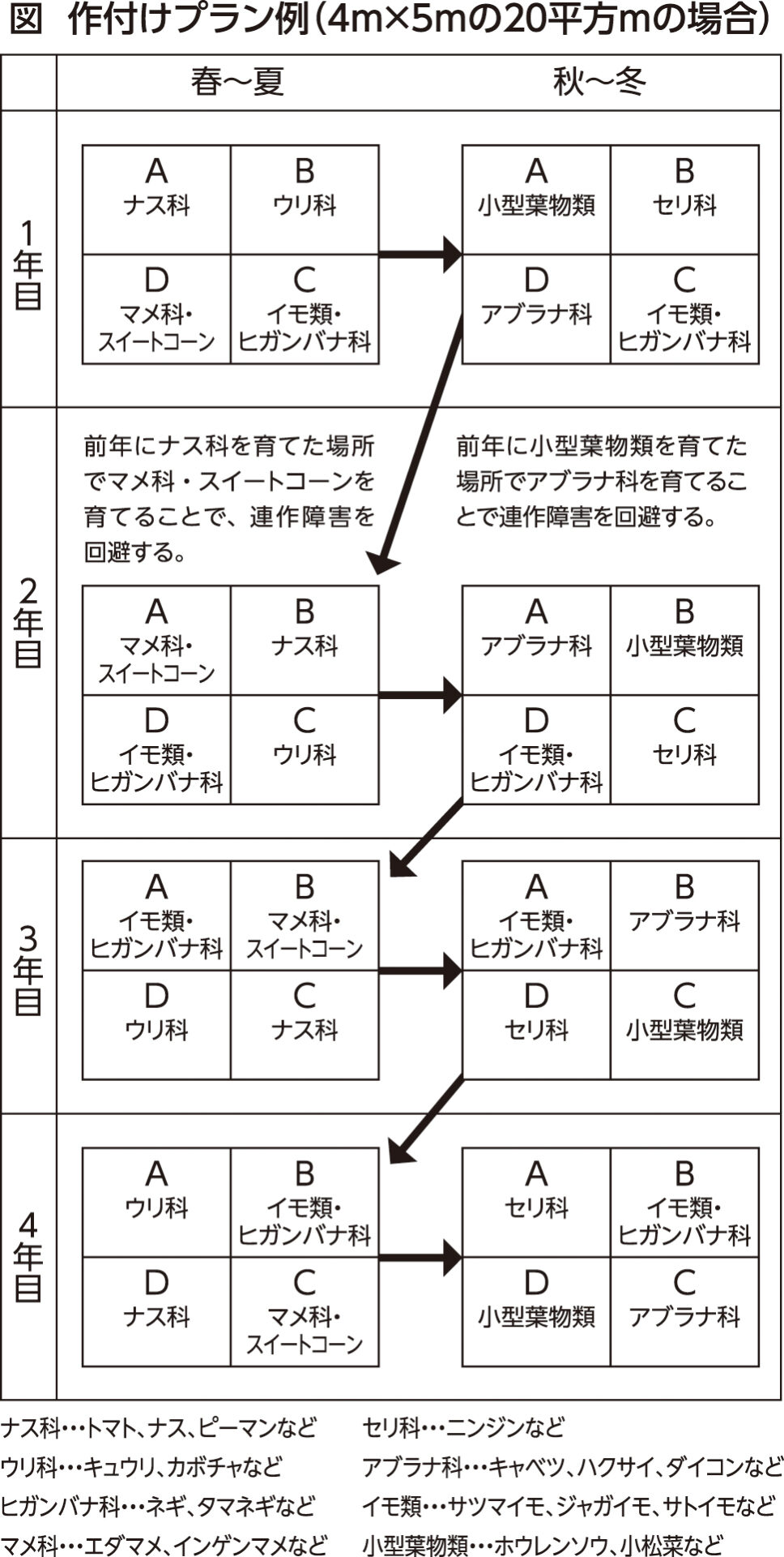 例えば、4m×5mの20平方mの畑の場合は、家庭での消費量が多いダイコン、キャベツ、ジャガイモ、ネギなどを中心に4区画以上に分けて作付けプランを立てると良いでしょう(図)。 作付けプランは次の手順で作りましょう。 ①菜園を均等に4ブロックに分ける。 ②作りたい野菜を「ナス科」「ウリ科」「イモ類・ヒガンバナ科」「マメ科・スイートコーン」「小型葉物類」「セリ科」「アブラナ科」の7種類に分ける。 ③1年ごとにブロックのローテーションを行う。 このようなローテーションで、ナス科やエンドウなどの連作障害をおおむね避けることができます。
