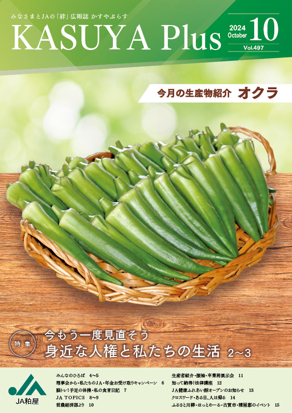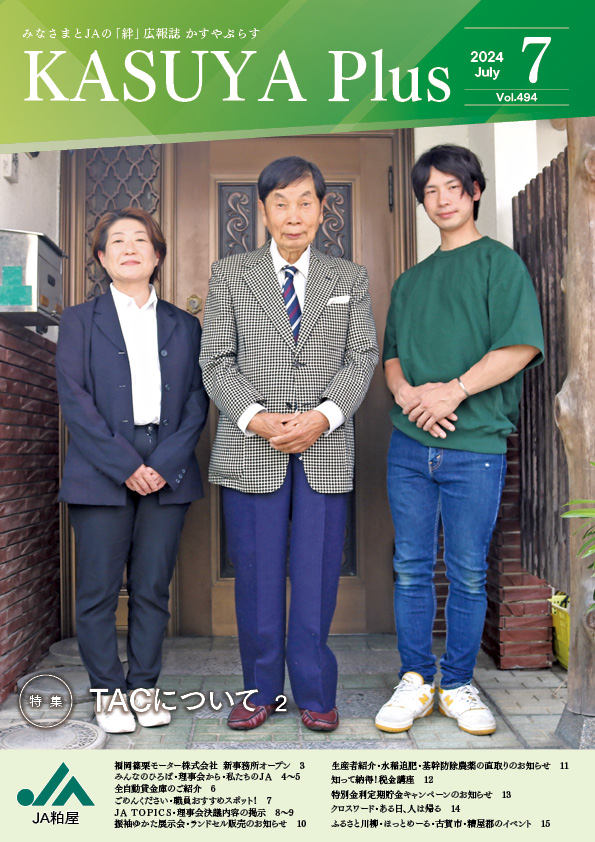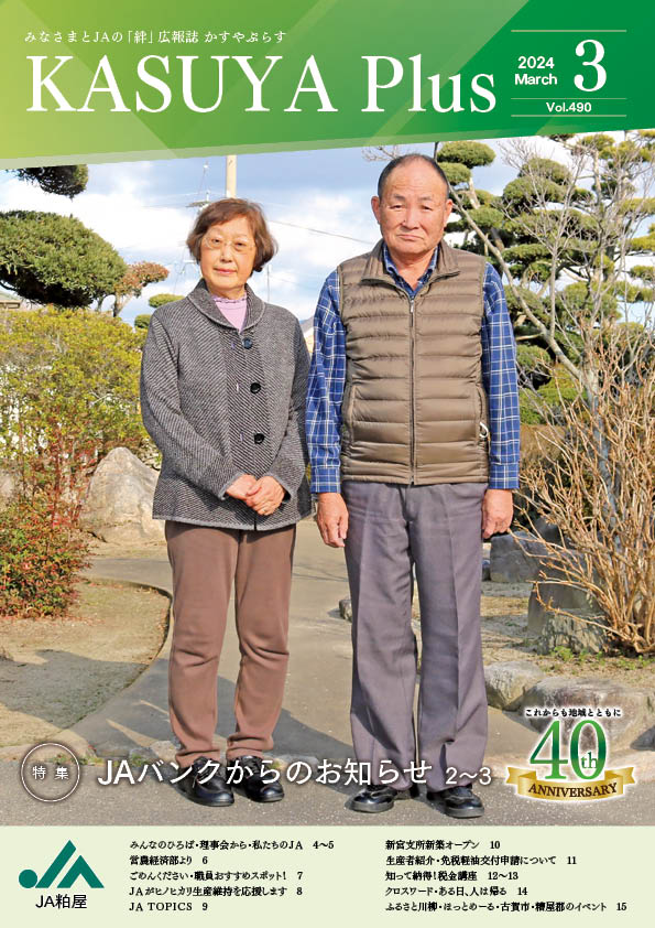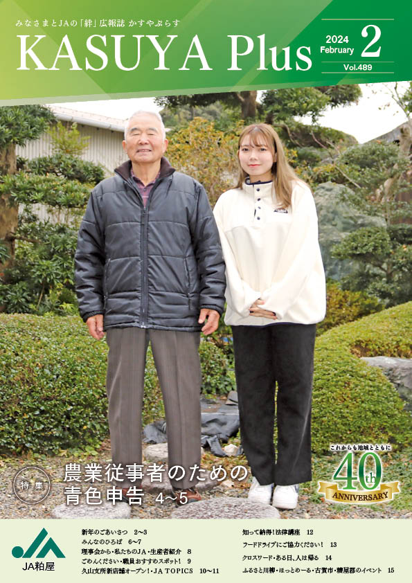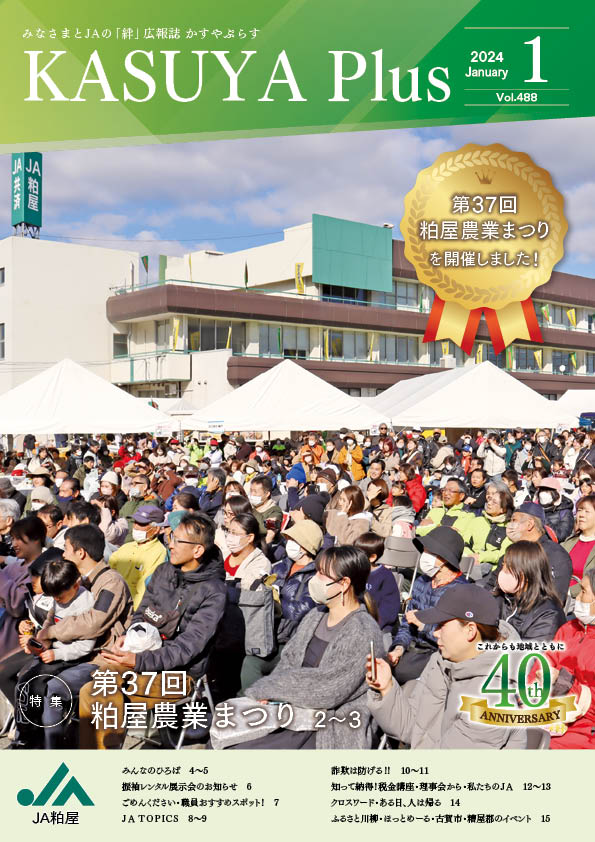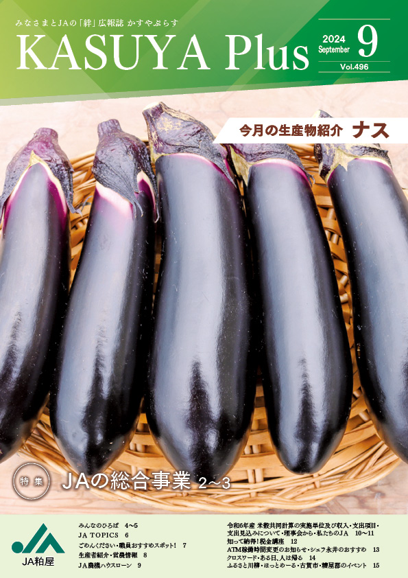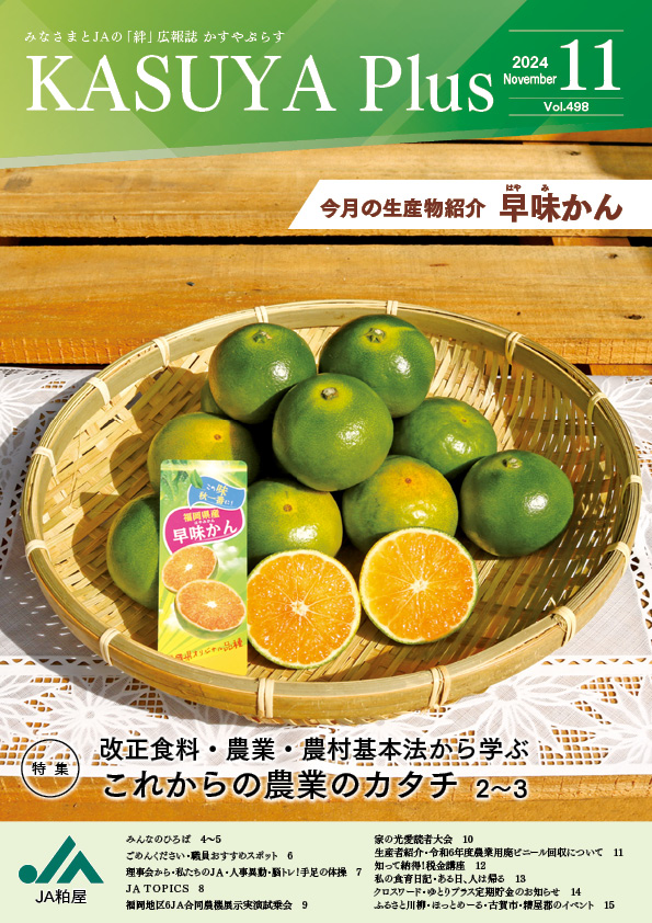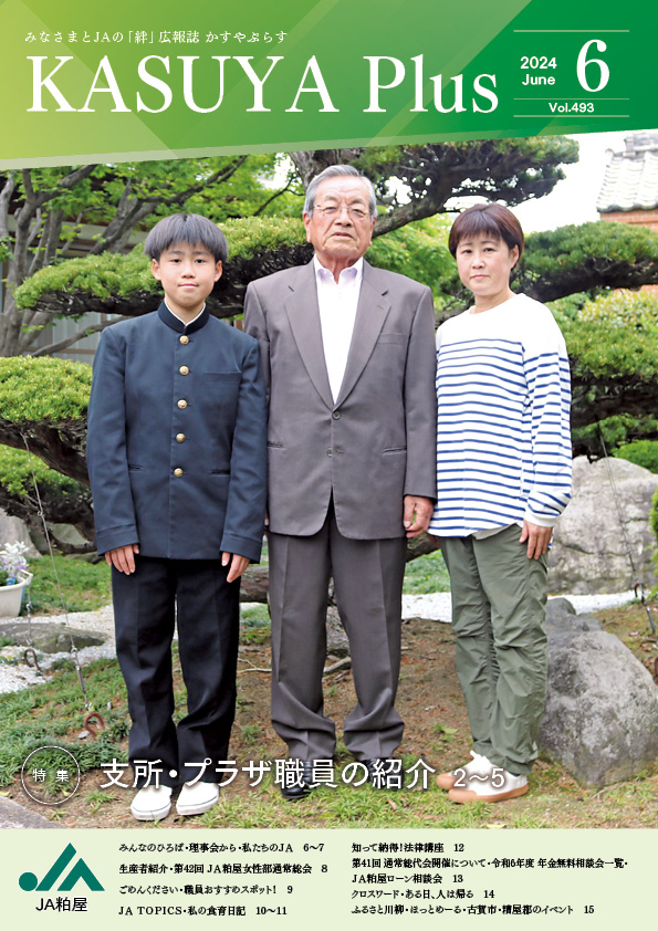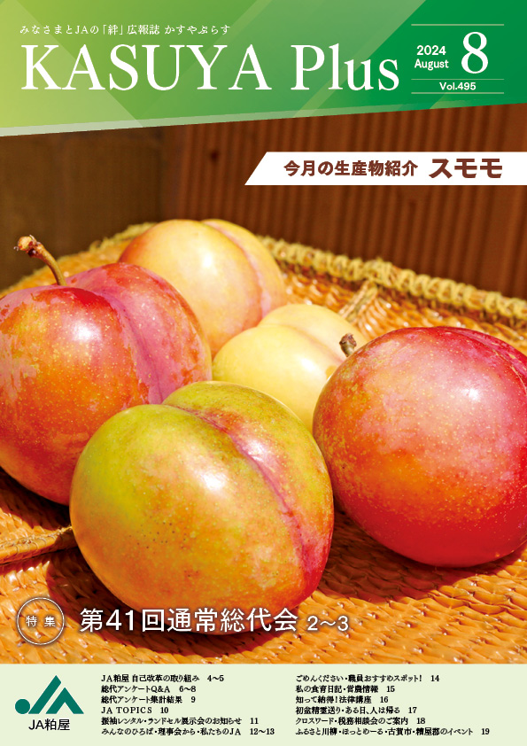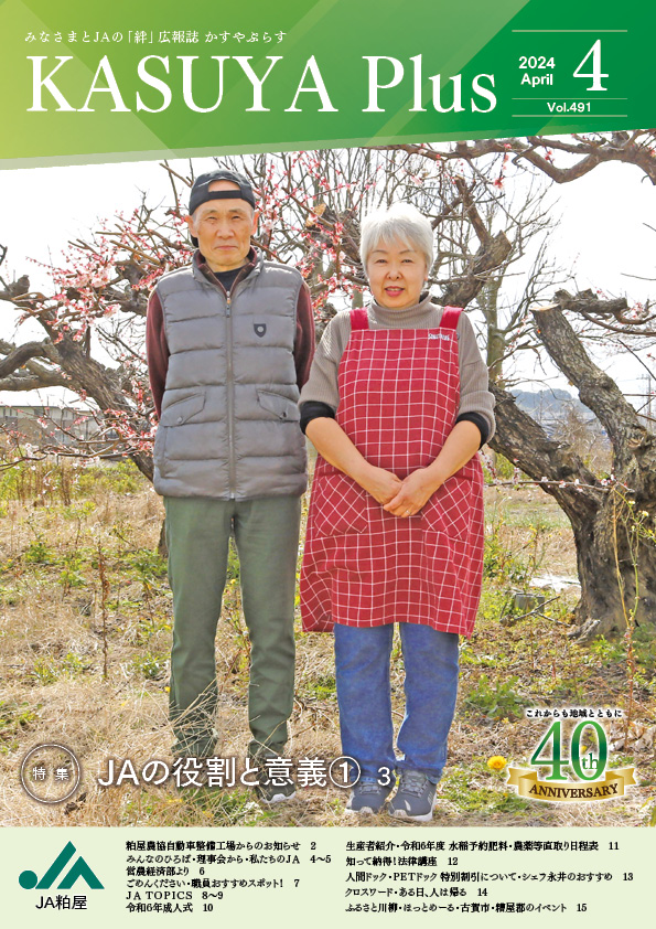 『KASUYA Plus』は毎月発行している組合員向け広報誌です。特集をはじめとして、時期に応じた営農情報や生産者の紹介、JAや地域の話題・紹介まで役立つ情報を多数掲載しています。